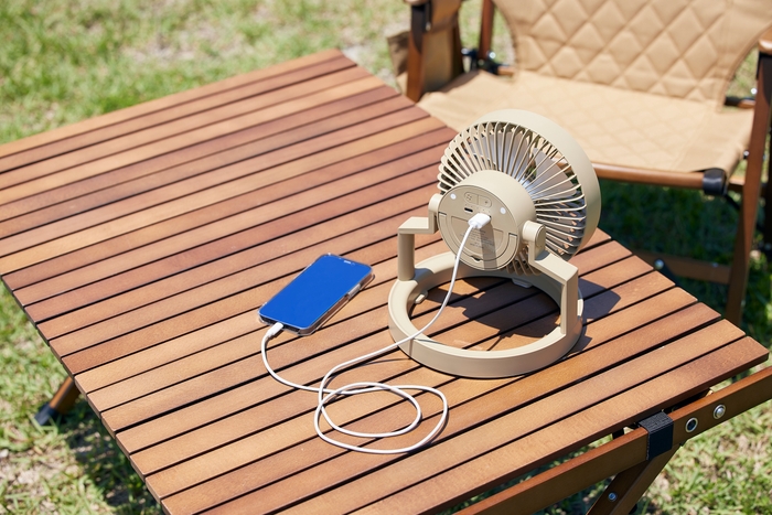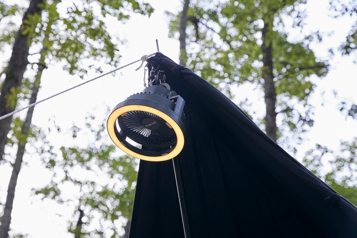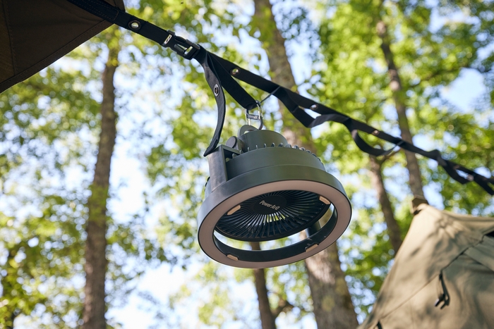 本製品は、「ファン」「ライト」「バッテリー」を1台で担うサーキュレーター。炭おこしやテント内の空気循環など、キャンプシーンに合わせて3段階の風力調節が行うことができます。充電することでコードレスで使うこともでき、軽量のためテント上部に引っ掛けて吊るすことも可能。さらにテントライト、モバイルバッテリー機能を追加することで、アウトドアシーンでの活用の幅が広がりました。