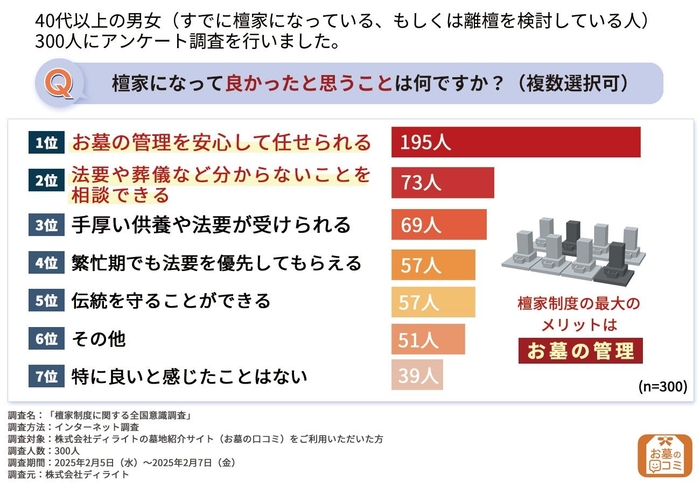 檀家のメリットとして「お墓の管理を安心して任せられる」(195人)が最も多い