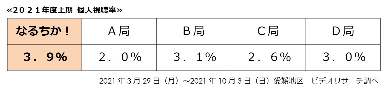 愛媛朝日テレビ制作番組「ちかくナルナル なるちか!」(土曜午前9時30分~)の2021年度上期平均視聴率(個人視聴率)は3.9%で、同時間帯1位を獲得しました。