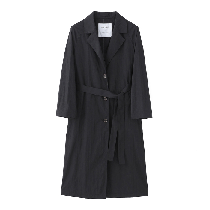 特徴のある素材感を活かすシンプルなテーラードカラー三つ釦に、抜け感を醸し出すラグラン袖。ロング丈のナローシルエットですっきりと着こなせるデザイン。着こなしの幅を広げる共地の結びベルトをセット。
