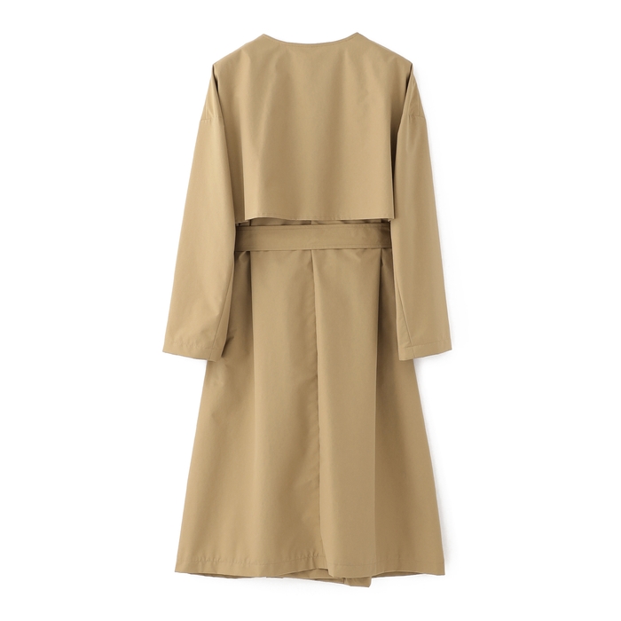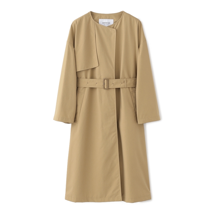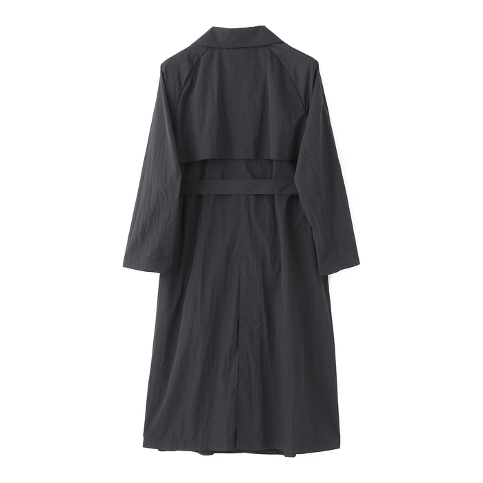 アシメトリーに配置したガンフラップやゆったりとドロップしたショルダーがモードなムードを醸し出す、比翼ボタン開きのシンプルなカラーレストレンチコート。共地のベルトにはレザー革巻きバックルを使用。