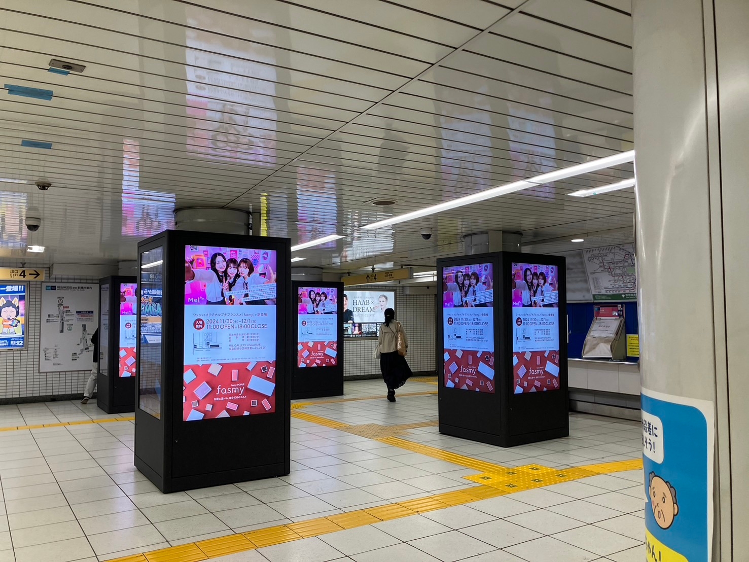 11月1日から一ヶ月間限定で「fasmy POPUP」開催を告知したデジタル広告を、東京メトロの明治院宮前駅の構内サイネージに掲載しております。ぜひ、お立ち寄りください!