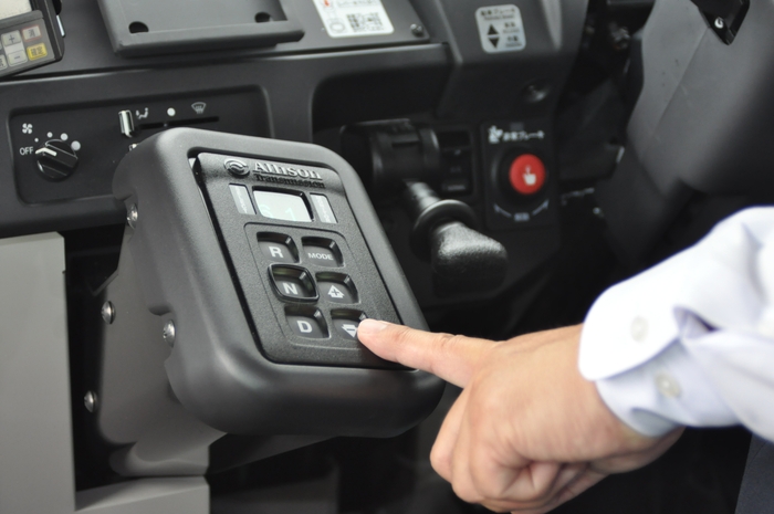坂道の多い路線をAMT搭載車で走行する際、ドライバーは変速時に発生するギヤ抜けによる減速を嫌い、シフト固定して走行しがちとなります。一方、遊星歯車構造を持つアリソンAT搭載車は、Continuous Power Technology(TM)により、走行条件によって発生する変速も間断なくトルクをタイヤに伝達するため、ドライバーはシフト操作を意識することなく走行が可能になります。阪急バス株式会社宝塚営業所が運行を担う路線は、坂道が多い山手などの住宅街のみならず、発進と停止が多い都市部も含まれるため、AT搭載車を採用する利点は大きいと考えられます。また、同社が多数採用しているAT搭載の大型路線バスと同一のボタン式シフトセレクターが採用されていることにより、大型路線バスの運行に慣れたドライバーがストレスなく中型路線バスを運行することができます。