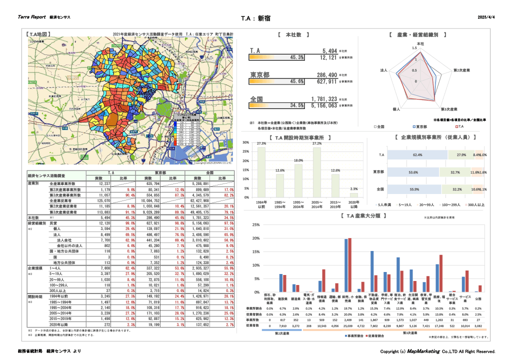 マップマーケティング株式会社(本社:東京都渋谷区、代表取締役社長:新田 正則)は、TerraMapシリーズのオプションデータ「経済センサス活動調査データ2021」(以下、経済センサス活動調査データ)を2025年4月8日にリリースしました。
