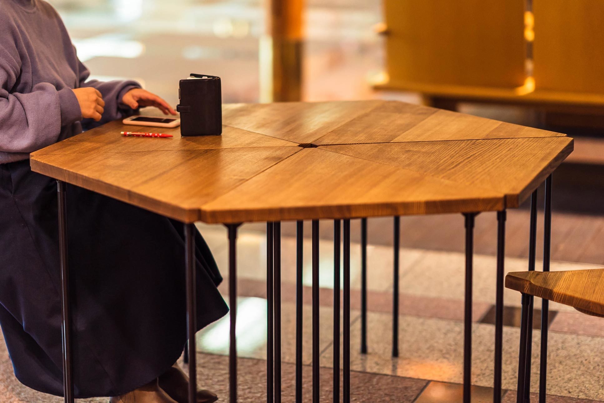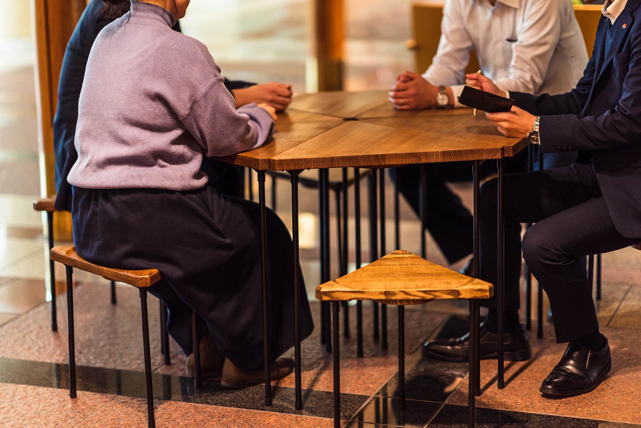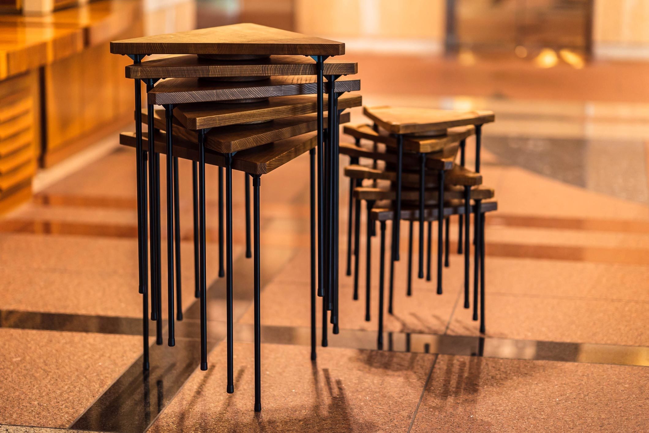 「WOM -ワム- Multi triangular wood table & stool」は、組み合わせを変えてセッティングするとテーブルの形や大きさを自由に変えることが出来る新しい家具です。