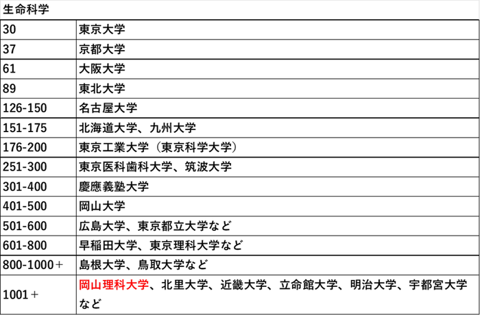 物理科学(Physical Science)と生命科学(Life Science)の分野において日本の大学でランクインしたのは57校。初のランクインを達成した岡山理科大学は、生命科学(Life Science)で北里大学や明治大学、物理科学(Physical Science)で東京理科大学や横浜国立大学、岡山大学と同ランクとなり、中四国の私学では唯一のランクインとなりました。