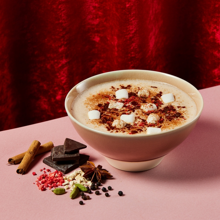 7種類のスパイスをブレンドしたカフェで人気のアッサムチャイにチョコレートを合わせ、マシュマロとドライストロベリーをトッピング。複雑に重なりあう奥深いスパイスの香りとチョコレートのまろやかな甘みが織りなす、身も心もほっこりとあたたまるスイーツドリンクです。