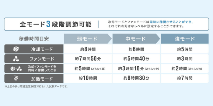 稼働時間(冷却+ファンモード「強」設定の場合):約2時間