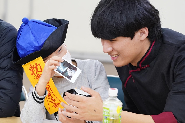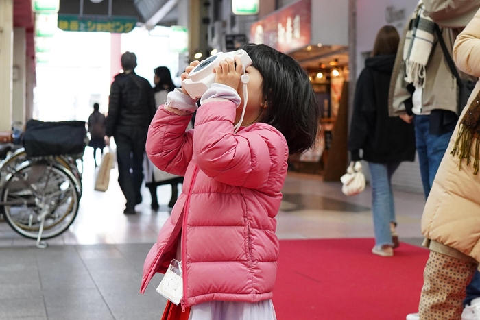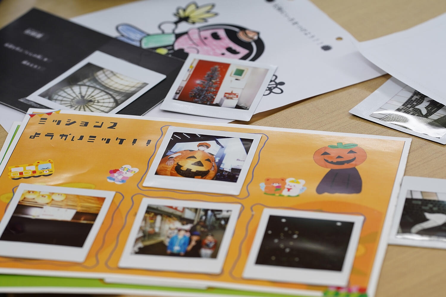 まず当日の様子をレポートしましょう。「柳ヶ瀬日常ニナーレ2023」は、2023年11月19日から12月31日の約1ヶ月半にわたって開かれ、「やながせこどものがっこう」は11月25日と12月9日の2回、プログラムを実施しました。タイトルは、「〜怪盗Xからの挑戦状〜商店街で妖怪を探すこどもRPG」。怪盗Xが岐阜城から宝箱を盗んだために商店街に妖怪が逃げ出してしまった。そんなストーリーに沿って、子どもたちは謎解きにチャレンジし、妖怪たちから与えられるミッションをクリアしていきます。一人ひとりがインスタントカメラを持ち、ミッションで使用するほか、気になったものをパシャパシャと撮っていく。すべての謎を解きゴールした後には、撮影した写真を見ながら、面白いと感じたことを共有しました。