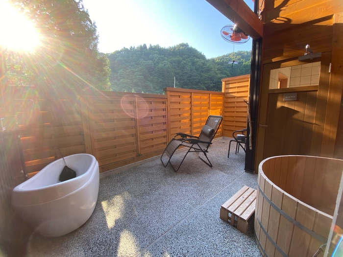 渓流サイト×1、ショップ、貸切スパ&サウナ×2棟、