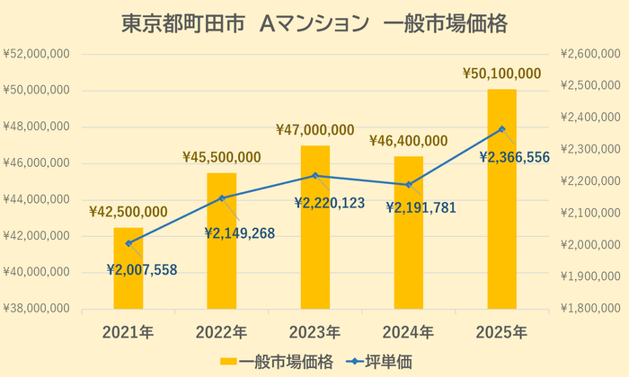 Aマンションの一般市場価格・坪単価の推移は上記【図3】の通りです。
