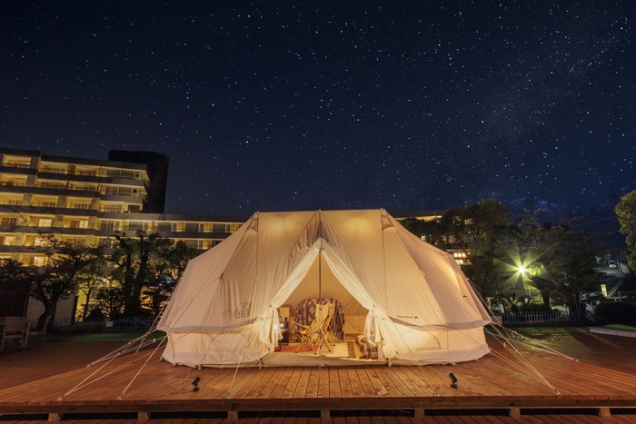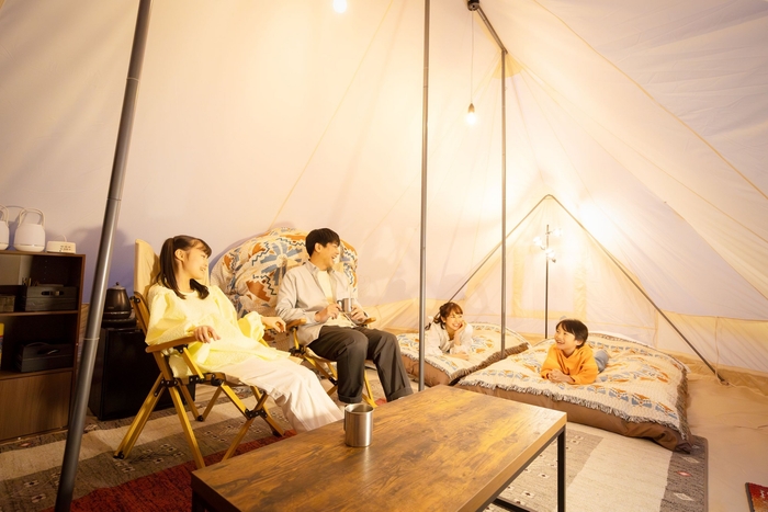 ウッドデッキを備えた大型テント内には、ソファーや寝具、チェア、ライトなどをご用意し、本格的なアウトドア気分をご体験いただけます。館内のバイキングや大浴場ももちろんご利用いただけますので、アウトドアの開放感と、癒しのひと時を同時にお楽しみいただけます。