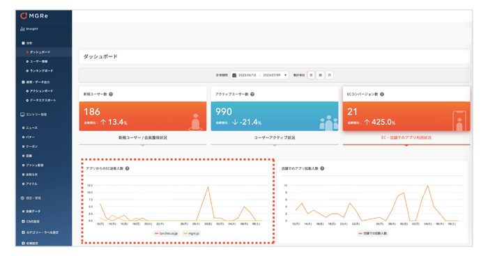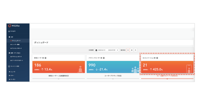 「ECコンバージョン計測」機能は、MGReのダッシュボード上で閲覧でき、アプリからECサイトへの送客数、購買数、購買プロセスなどの数値を可視化し、アプリとECサイトをつないだ購買経路分析が可能です。
