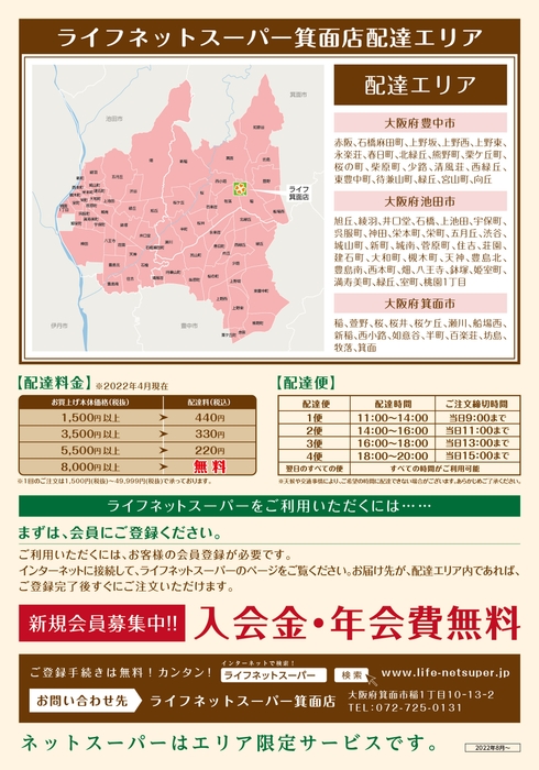 ご注文いただいた商品を店舗からご自宅へお届け「ライフネットスーパー箕面店」サービス開始【豊中市内の配達エリアを拡大、池田市内・箕面市内の一部地域でもご利用可能に!】