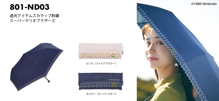 軽量生地とカーボンを使用した軽くてしなやかな骨を組み合わせた90gの超軽量傘。ゲーム中でも印象的だった地下ステージや水中ステージをイメージしたデザインや、さりげないスーパースターのデザインをご用意しています。男性でも持ちやすいデザインに仕上がっています。