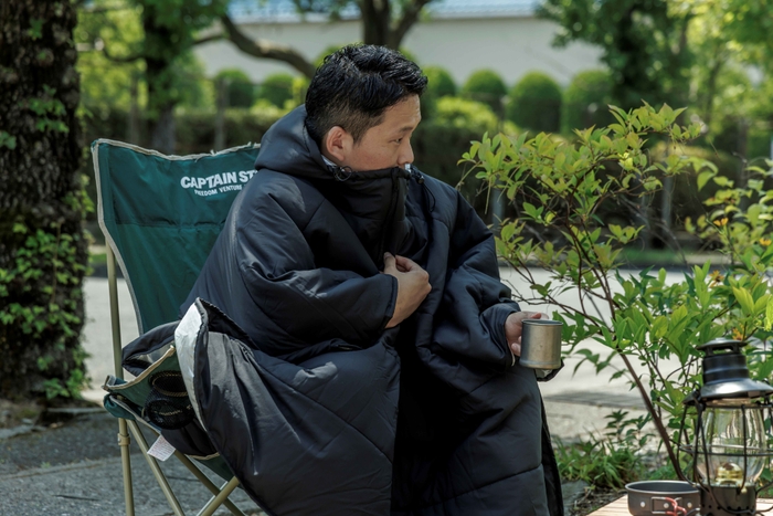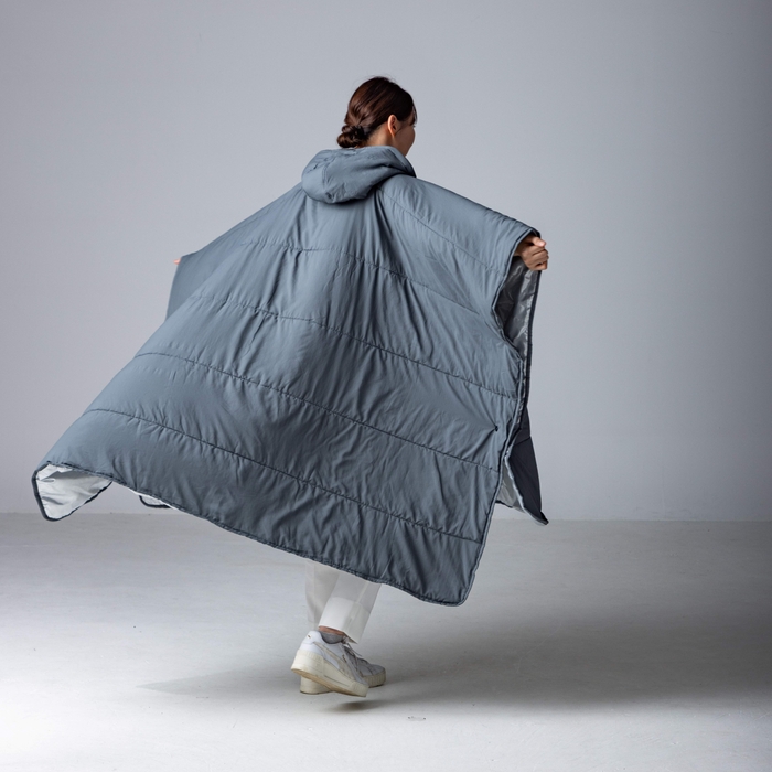 ポンチョ型の本製品はサイドにボタンがあり、はずして広げると横140cm×縦195cmのシンプルな長方形に。可動域の広い形なので肩が凝りにくく、動きやすい。さらに広げればブランケットのように使うこともできます。
