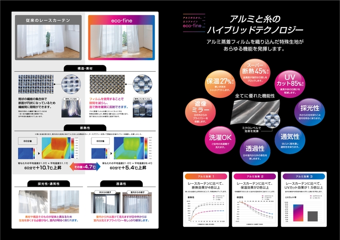 たて糸にアルミ蒸着フィルムをスリットした糸を、よこ糸にポリエステル糸を同時に織り込むことで保温・断熱・遮熱・UVカット・通気性・透過性を叶えた当社独自の特殊テキスタイル「eco-fine(R)」。この生地を内生地に使用し、さらに中綿には帝人製吸湿発熱性素材「サンバーナー(R)」を採用。高い保温力と湿気による吸湿発熱のダブルのヒート構造が地熱のようなポカポカした暖かさが持続します。