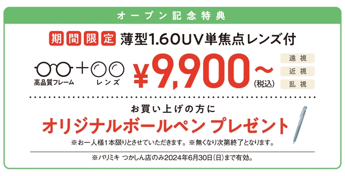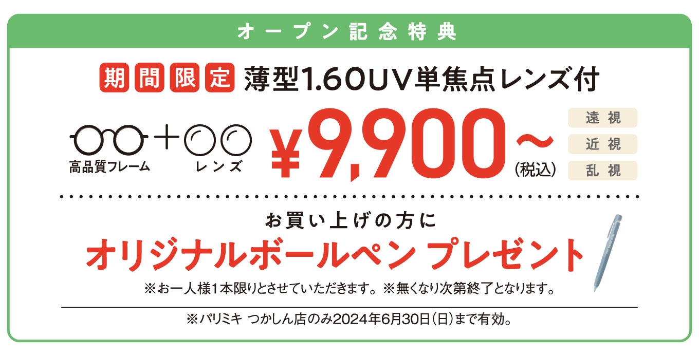 オープンを記念し、期間限定で薄型1.60UV単焦点レンズが付いてメガネ一式\9,900(税込)~、また、期間中お買い上げの方に、オリジナルボールペンをプレゼントいたします!