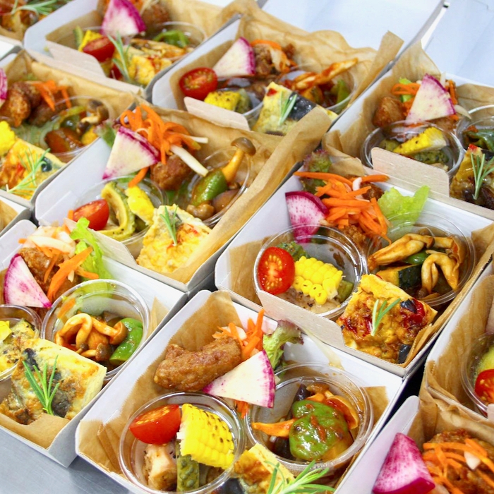 交流がメインのイベントや、セミナーの合間などで、満腹が目的ではないけど華やかにしたい、イベント会場内を自由に動けるようにしたい、料理を片手にドリンクも楽しみたいなら、大人数でも配布が簡単な、シェフお手製のライトミールボックス。