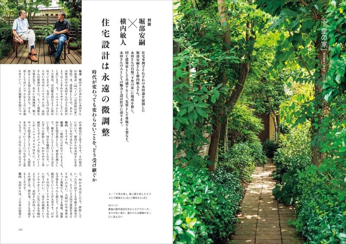 地味の中の滋味 ――対談より抜粋横内 世間一般からみたら、永田さんの建築って地味だと思うんですよ。それはインテリアに至っても地味。でも地味であることはとても大事で、土に根ざした、むしろ滋味というか。根っこが生えてる。マイナスな意味で地味じゃなくて、建築も生き方に対する考え方も、滋味に富んでる。風土なり土地なり、日本という文化なりに根ざしている。そこをはずすと、人の生活にとっては余分なものが多くなって、本来の豊かさを得る時に、むしろマイナスになってしまうということを彼の建築は教えてくれてる気がするんですよね。堀部 地味の中にある滋味。横内 日本がすごく豊かになって、なんでも手に入る。建築のつくり方も多様化して、どんな材料も使えるし、表現の種類も多彩ですよね。でもそういう中で、あえて滋味を大切にする。その態度が、住宅を設計する人間にとって、基本的に大切にしなければいけないものなんじゃないかと思います。やはりその背景には、人間の豊かさは物では得られないという価値観がある。物質的な意味での家に、いくらお金をかけて凝ってつくっても、それでは豊かさにはつながらない。本来の人の豊かさは、家族との愛情だったり、何気ない日常生活の中のちょっとした幸せだったり、そういうものからしか得られない。堀部 日常の中にこそ美しさと豊かさを見出してました。