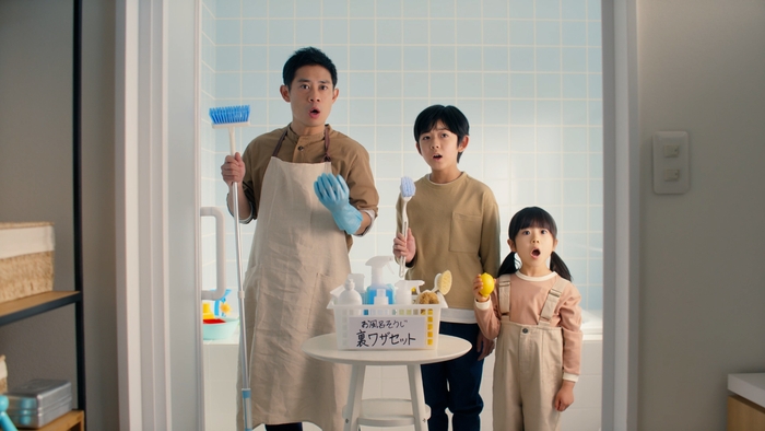 これまでお風呂掃除で色々試しては失敗してきたパパが用意したのは、ネットで調べた知識をもとに集めたパパ特製の裏ワザグッズ達。そんなパパにママが「ウラワザよりウルトラハード」とウルトラハードクリーナーバス用を紹介。“別格の洗浄力”を武器に、頑固な黒ズミや石鹸カスにも抜群な効果を発揮するバス用クリーナーに驚き感動するパパと子供たちを、ママは満足げに後ろから眺めていました。