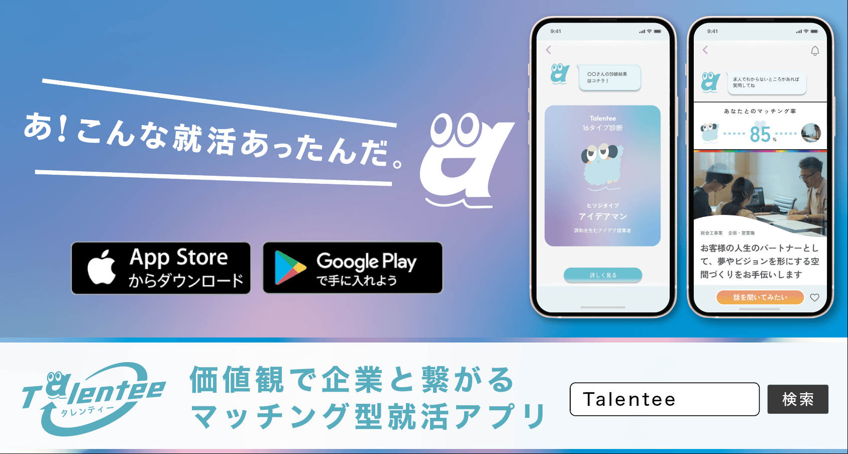 当社が提供する価値観マッチングツール「AIタレンティー」の導入により、事前の価値観診断を通じて、学生と企業が条件面に囚われない”相性の良さ”を可視化し、より本質的な出会いを生み出しました。