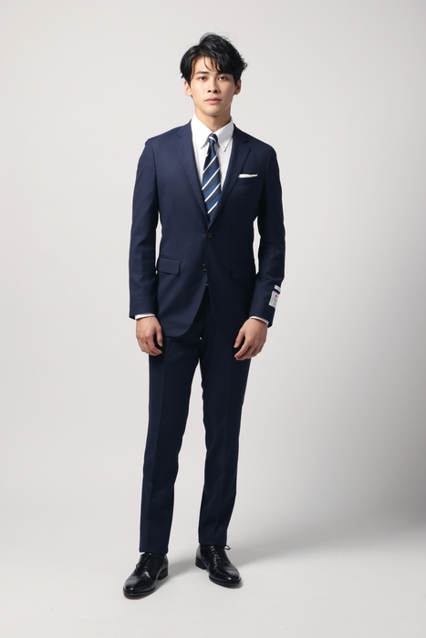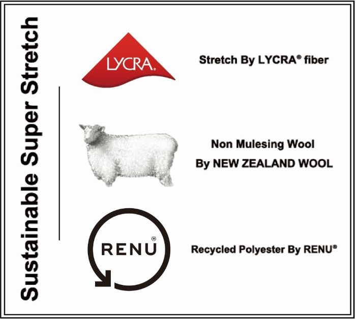 今回発売するスーツは、サステナブルな取り組みから生地にはリサイクル素材を使用しています。サーキュラーエコノミーを目的とした「RENU(レニュー)®」プロジェクトから生まれた繊維で、古着や生産時に出る端切れなどを原料とした素材です。また、ウール素材には、動物愛護の観点から羊の苦痛やストレスを抑えた、ノンミュールジングウールを採用するなどサステナブルの取り組みを意識した商品です。さらに、テレワークなど着こなしの軽装化や楽な着心地に慣れたビジネスパーソンに向け、かっちりとした見た目ながら着用の際のストレスを軽減する優れたストレッチ性を付加しています。ストレッチ素材にはスポーツウェアにも使用される「ライクラ T400®ファイバー」を採用することで、横方向への伸長率20%を実現しました。これは、一般的なストレッチ生地の2倍に相当します。