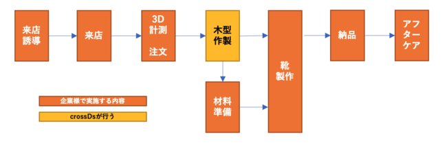 オーダーメイド3Dシューズを提供するためには、次の様な流れで、来店から納品までを行う事になります。当社が自社向けに行っている機能やサービスの必要な範囲を、必要な分だけパートナー企業様にご提供させて頂きます。サービス開始時の立ちあげに際しては、crossDsから事業開始に必要な知識やテクニックなどを企業様のレベルに合わせて伝達し、現場でのレクチャーも必要に応じて行います。パートナー企業様に実施いただく範囲と内容については状況に合わせて適宜調整する事が可能です。