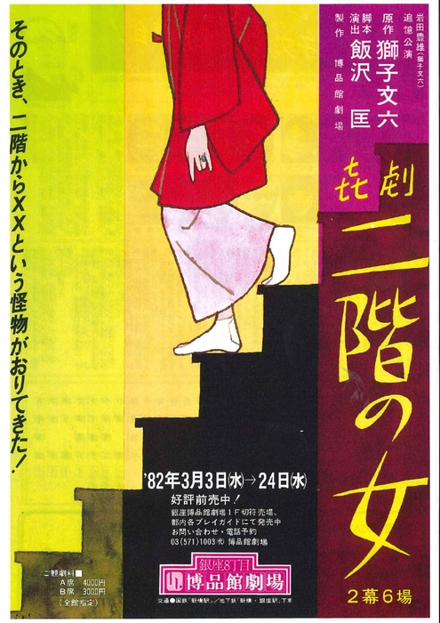 NLT顧問であった獅子文六(本名:岩田豊雄)と、喜劇路線の演出家飯沢匡の原作・脚本の「二階の女」は、岩田のユーモアと飯沢の知性が凝縮された作品である。このユーモアの再現こそNLTが、今行う意義と考えて上演する。演出は、リアルな人物造形への目配りと多角的な舞台空間の創造に定評のある鵜山仁を起用。NLTが目指す喜劇を生み出す。