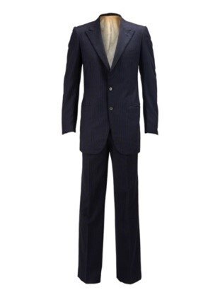 A navy blue pin-striped Brioni for Wilkes Bashford suit worn by Steve Jobs in the 1984 Macintosh computer release marketing photograph