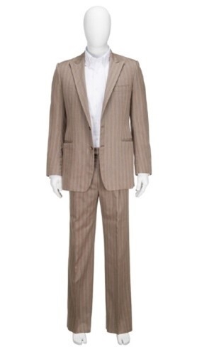 A taupe and white striped wool, two-piece suit by DiMitri Couture for Wilkes Bashford, seen in a photograph as worn by Jobs