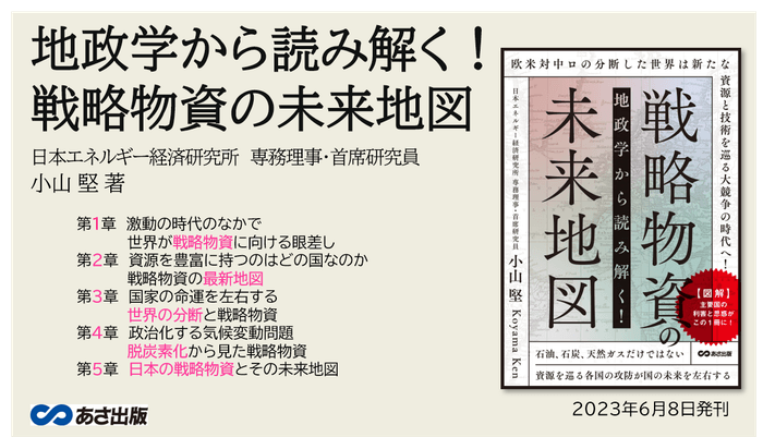 株式会社あさ出版(代表取締役:田賀井弘毅、所在地:東京都豊島区)は、小山堅著『地政学から読み解く!戦略物資の未来地図』http://www.asa21.com/book/b622553.html を2023年6月8日(木)に刊行いたします。