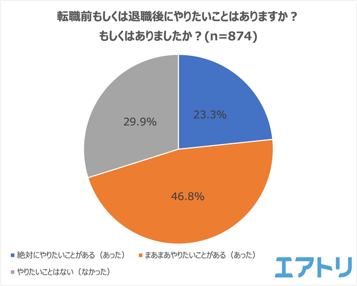 転職前もしくは退職後にやりたいことはあるか、もしくはあったかをきいたところ、「絶対にやりたいことがある(あった)」が23.3%、「まあまあやりたいことがある(あった)」が46.8%で合わせて70.1%の人が「やりたいことがある(あった)」と回答しました。転職前もしくは退職後の時間を有意義に過ごそうと思っている人が多くいることがわかります。