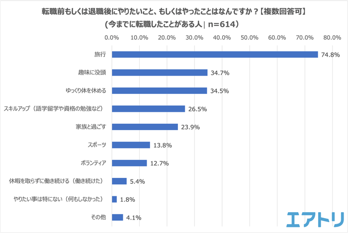 今までに転職をしたことがあると回答した人に、転職前もしくは退職後にやりたいこと、もしくはやったことはなにかをきいたところ、圧倒的に多かったのは「旅行」で74.8%となりました。つづいて「趣味に没頭(34.7%)」「ゆっくり体を休める(34.5%)」と続きました。転職前や退職後など、まとまった休みが取れる時間を有効活用したいという考えの人や、かなり忙しくしていたためまずはゆっくり休みたい、といった意見が多く寄せられました。