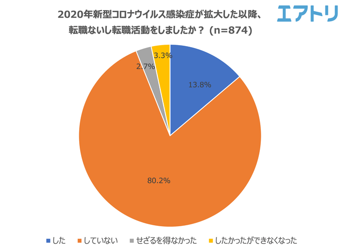 2020年の新型コロナウイルス感染症拡大以降に、転職ないし転職活動を「していない」人が最も多く80.2%となりました。転職ないし転職活動をした人は13.8%にとどまりました。