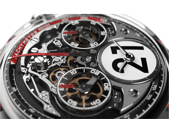 レーシングカーに用いられる、空気の流れをコントロールするエアロダイナミクスの技術を、時計全体のフォルムに取り入れています。これにより、表面の触り心地や装着感を高めています。ラグは横方向にくり抜かれたオープンワーク仕様になっており、ラバーストラップはケースとぴったり合うように特別にデザインされています。暗所では、秒針・クロノグラフ秒針・30分積算針・フランジの目盛りが、スピードメーターのように発光し、視認性を確保します。