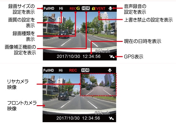 ◆録画中の液晶表示:常時点灯/速度連動/時計表示/フロント・リヤ2画面/OFF