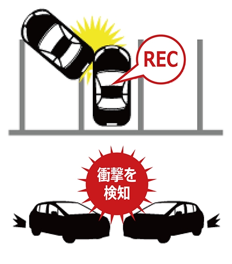 事故等の大きな衝撃を受けた際、録画を自動で停止します。これにより重要な映像を上書きすることがありません。※衝撃検出感度はOFF含め11段階に調整できます。