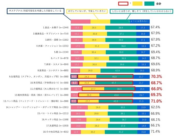 ・一方、「衛生用品」(介護用品・生理用品・育児用品・ペット用品)を購入する方は、「サステナブルな行動」の意識は1割未満にとどまる。