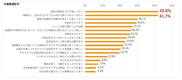・「サステナブルな生活」は、「商品の価格はあげてほしくない」「無理なく、自分ができそうなことから取り入れていきたい」が4割以上となる。