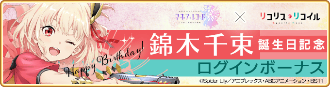 『期間限定 錦木千束 ピックアップガチャ』と『有償限定 ステップアップガチャ 錦木千束編』および『期間限定 井ノ上たきな ピックアップガチャ』と『有償限定 ステップアップガチャ 井ノ上たきな編』を開催予定!また、イベント『Agent Magica~マギアレコード×リコリス・リコイル~』と『錦木千束 誕生日記念ログインボーナス』を開催予定!