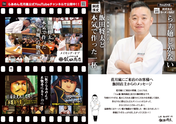 監修を務めるのは、業界最高権威と言われる「TRYラーメン大賞」4連覇、殿堂入りを果した「らぁ麺 飯田商店」の店主、飯田将太氏です。味作りはもちろん、調理、盛り付け、提供、その全てに飯田店主の熱い想いが込められ、“花月嵐ラーメンマエストロ”(商品開発)も全力でそれに応えて完成させた一杯です。発売前には飯田店主を招いての研修会も開催し、飯田店主に一人一人調理工程を見ていただき、「飯田商店」の魂を、その熱い言葉で改めて伝えてもらうなど、最後までクオリティを高めていきました。