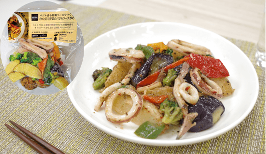 スルメイカと4種類の野菜を使用した彩り鮮やかな洋風メニュー。2種類のバジルやオレガノなどを使用した、香辛料の香りが食欲をそそるオイルソースで仕上げました。