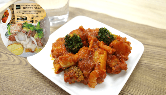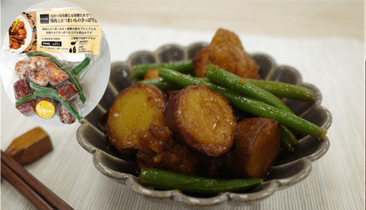 ミールキットの中でも人気の高い“黒酢”を使用した新メニュー。さつまいもの甘みと黒酢のコクのある酸味が相性抜群の食べ応えのある商品。