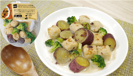 鶏団子と野菜のタイ風ココナッツミルク煮。ココナッツミルクとさつまいもの優しい甘みを活かしました。隠し味にナンプラーを加え、甘みの中にもコクを感じられます。