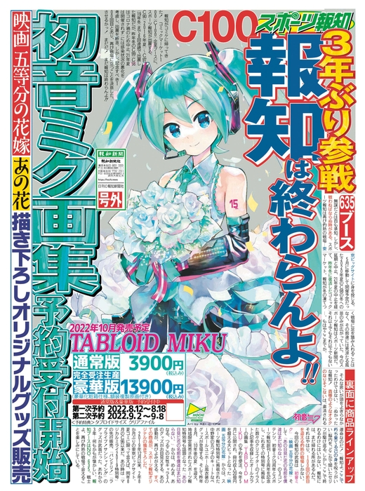 初音ミク15周年と報知新聞150周年を記念し10月に発売予定の画集「TABLOID MIKU」の予約受付を「報知エンターテインメントマーケット(H.O.E.M)」(https://hochi-em.myshopify.com/)サイト内で実施中です。報知新聞社は2014年から数多くの初音ミクタブロイド特別号を発行してきました。その特別号に掲載された数々のクリエイターの描き下ろしイラストとインタビューを収録したオールカラーの画集。「通常版」(税込3,900円)に加え額装複製原画付きで豪華化粧箱使用の「豪華版」(税込13,900円)も販売します。コミケ会場では画集の表紙イラストを使用した号外を配布。ブースではサンプル展示も行っています。