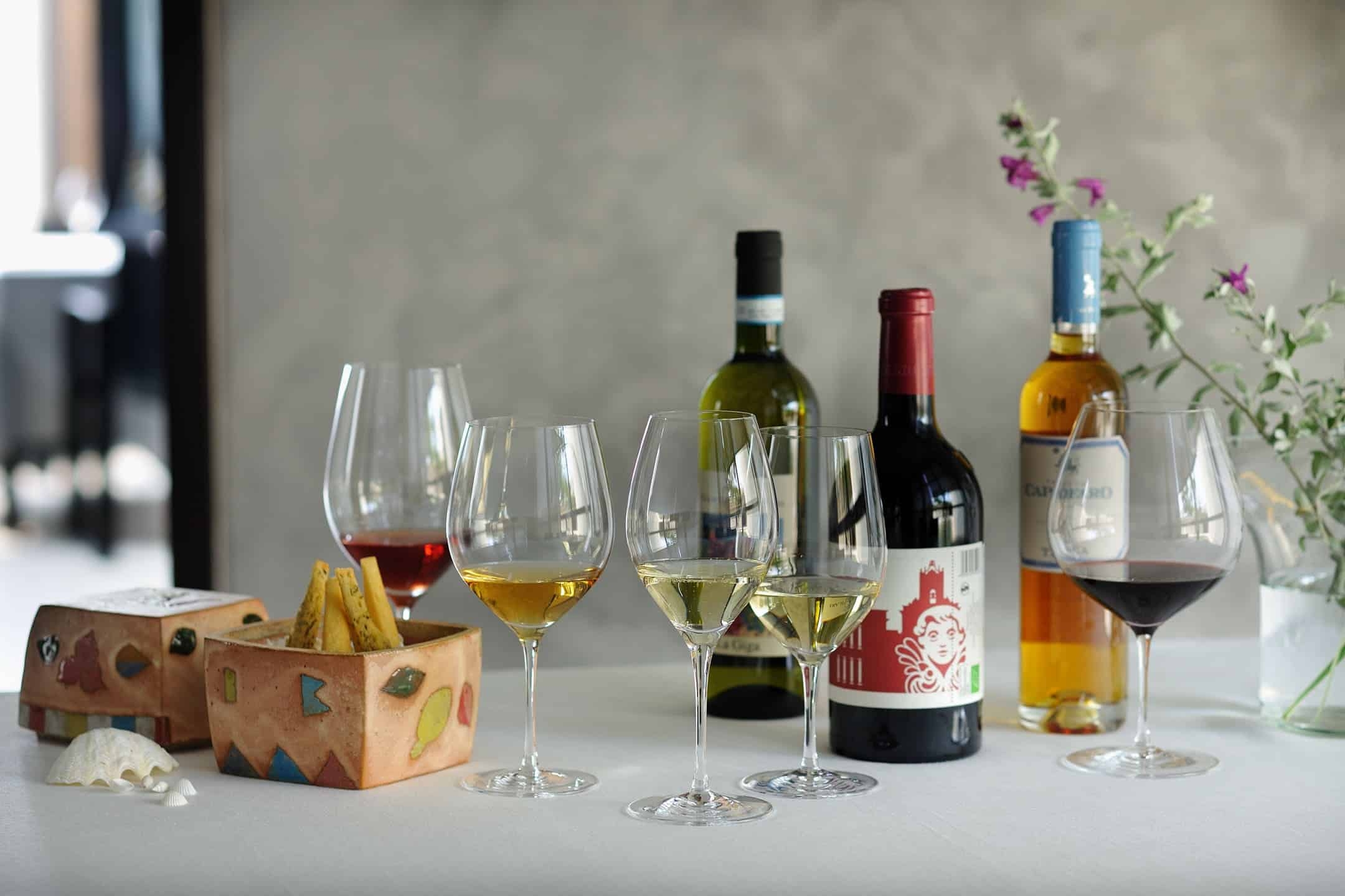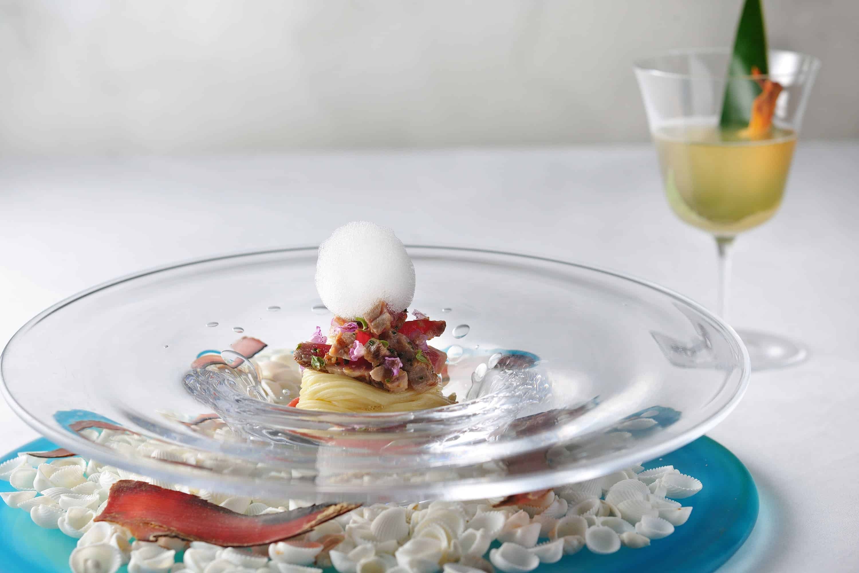 イタリアのシチリア島は、沖縄と同様に美しい海と温暖な気候に恵まれています。新鮮な魚介や柑橘を食材に多用していることや、他地域からの影響を取り入れながら独自の料理文化を築いていることも似ている点です。類似性のある土地で用いられる料理法は、沖縄で親しまれる食材との相性も良いと考え「琉球シチリアーナ」を考案しました。沖縄とシチリアが合わさることで生まれる、新たな食の魅力を提案します。また料理に合わせて南イタリアを中心に90種以上のワインを取り揃えています。国内外のワインに精通するソムリエがセレクトする独創性のあるワインペアリングのコースでは、乾杯からデザートまで7種のワインとのマリアージュでディナーを堪能できます。