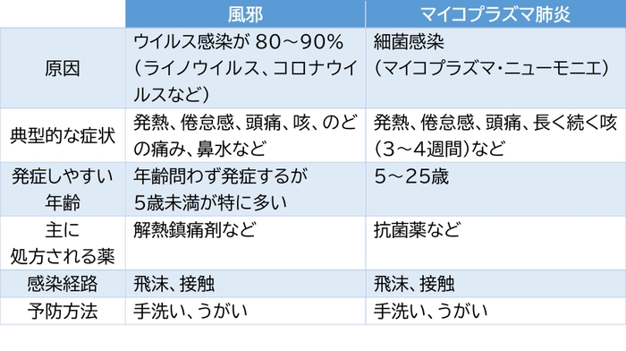一般的な風邪とマイコプラズマ肺炎の特徴を表にまとめました。