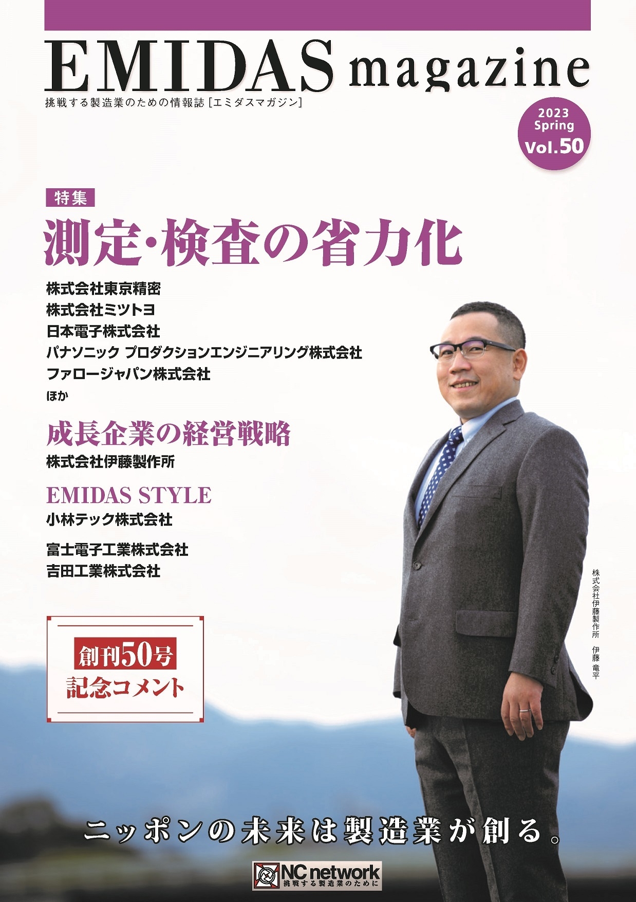 エミダスマガジン50号の特集は「測定・検査の省力化」。大手測定機器メーカーに最新の技術トレンドをインタビューするとともに、測定機器を実際に使う金型・治具、機械加工、プレス・鍛造、成形、鋳造、表面処理など各業界の中小製造業より、品質管理の現状と今後の展望を伺いました。そのインタビューをもとに編集部が作成した「理想の検査室」や「設備マトリクス」は測定・検査設備がものづくりのどの工程で使用するものなのか、各業種の特徴が一目瞭然となっています。また、創刊50号を記念し、これまでエミダスマガジンでお世話になった方々より頂戴したお祝いメッセージも掲載しています。