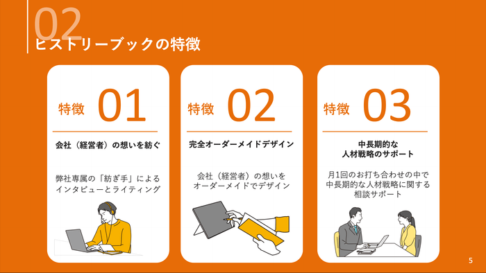 “ヒストリーブック”は、社史とは異なったまるで一冊の小説のような読み味となり、後継者候補や社員、役員、そのほかステークホルダーへ、企業の持つ想いをスムーズかつストレートに伝えるツールとなります。